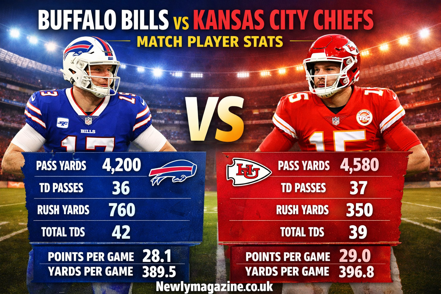 When comparing their stats, both quarterbacks often finish games with similar yardage totals, but Mahomes tends to have a slight edge in passing efficiency, while Allen contributes more in the rushing department.